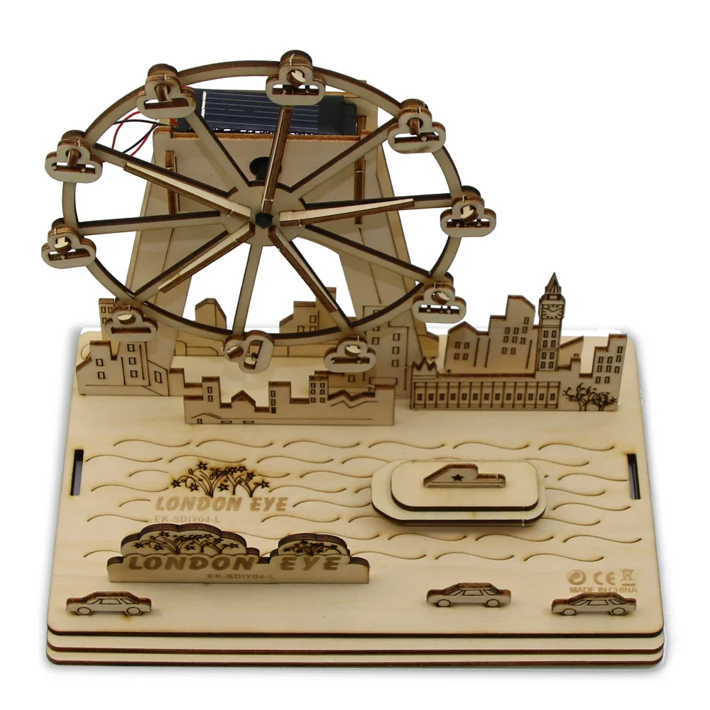 It's the London Eye. It's the Millennium Wheel! It's a modern landmark. It overlooks the River Thames, boats, towers, bridges and more. This is a DIY plywood kit. The big wheel is driven by solar energy. This easy to assemble puzzle-like toy comes with a solar panel, sand paper stick, and wooden puzzle pieces that when put together, forms a miniature wooden scale of the famous London Eye Ferris Wheel. Economical, educational and environment-friendly, this wood-crafted toy is 100% solar powered so you don’t need to spend more on batteries and electricity consumption. All it needs is a minimal exposure to sunlight to operate 10 times per minute, giving you a vivid close-up look of the iconic London landmark. Students will love to build it and observe the conversion between solar energy and mechanical energy. Have fun building it yourself. It is delivered unassembled with a brown box.